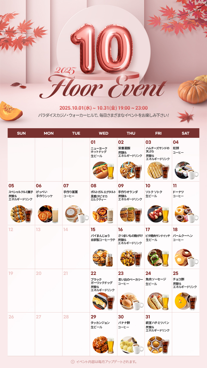 ソウルのパラダイスカジノ・ウォーカーヒルでは、ご来場者が誰でもフリーで楽しめるフロアイベントを毎月実施しております。